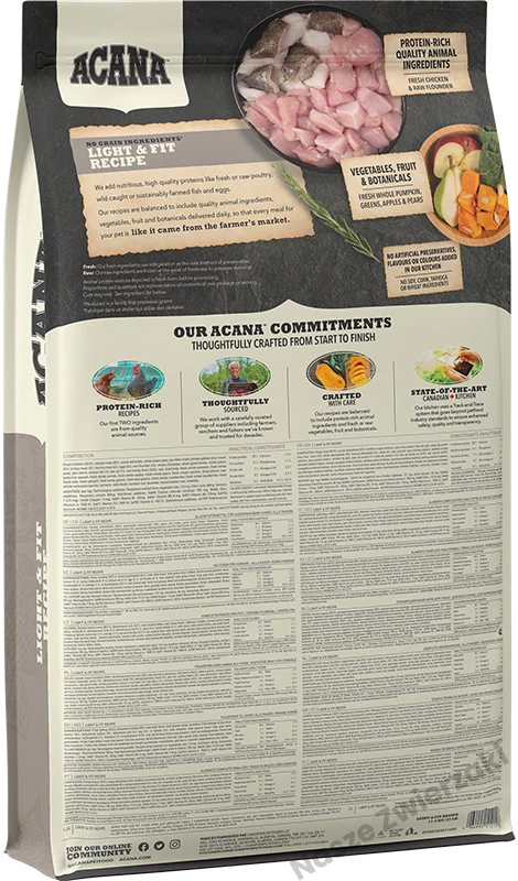 Formuła jedzenia ACANA Light and Fit odpowiada wymogom żywieniowym ustalonym przez AAFCO – profile żywieniowe dla psów we wszystkich stadiach życia.