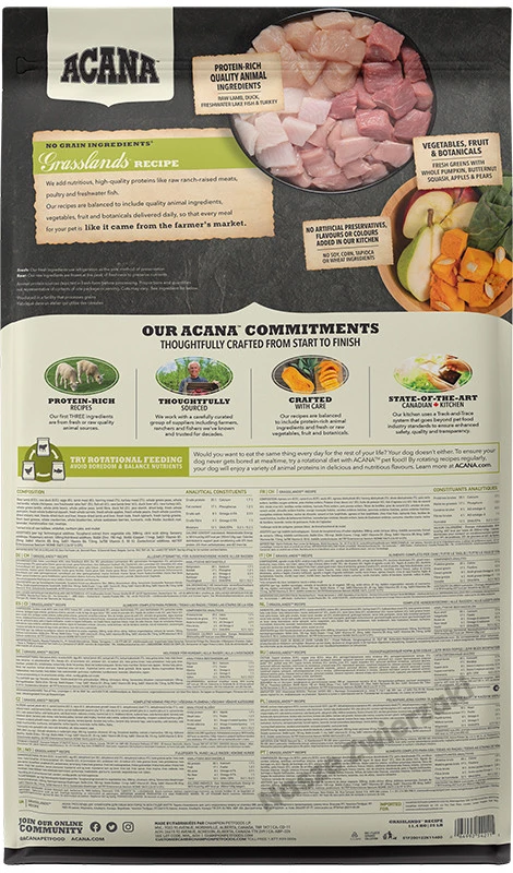 ACANA Highest Protein Grasslands to wyjątkowo odżywcza karma stworzona dla psów wszystkich ras i na każdym etapie życia – z wyjątkiem dużych ras w okresie wzrostu. Jej receptura została oparta na naturalnym modelu żywienia przodków psów i wzbogacona o wyjątkową różnorodność mięs najwyższej jakości.