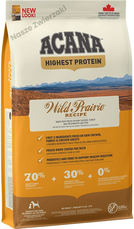 ACANA Highest Protein Wild Prairie to pełnowartościowa karma, która odzwierciedla naturalną dietę przodków psów. Stworzona z myślą o psach wszystkich ras i w każdym wieku (z wyjątkiem szczeniąt dużych ras do 14. tygodnia życia), łączy wyjątkową smakowitość z wysoką zawartością białka i niskim poziomem węglowodanów.