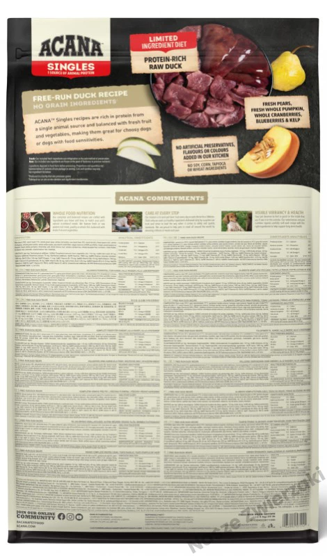ACANA Singles Free-Run Duck to pełnoporcjowe, zbilansowane jedzenie dla psów wszystkich ras i w każdym wieku, z wyjątkiem szczeniąt ras dużych.