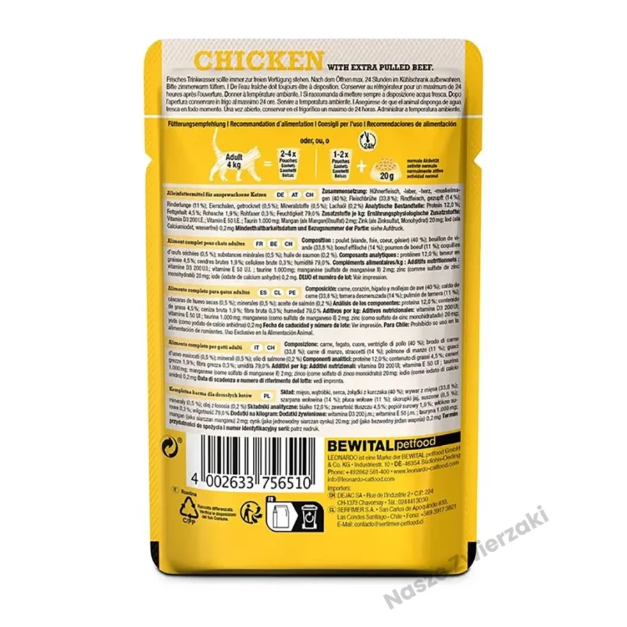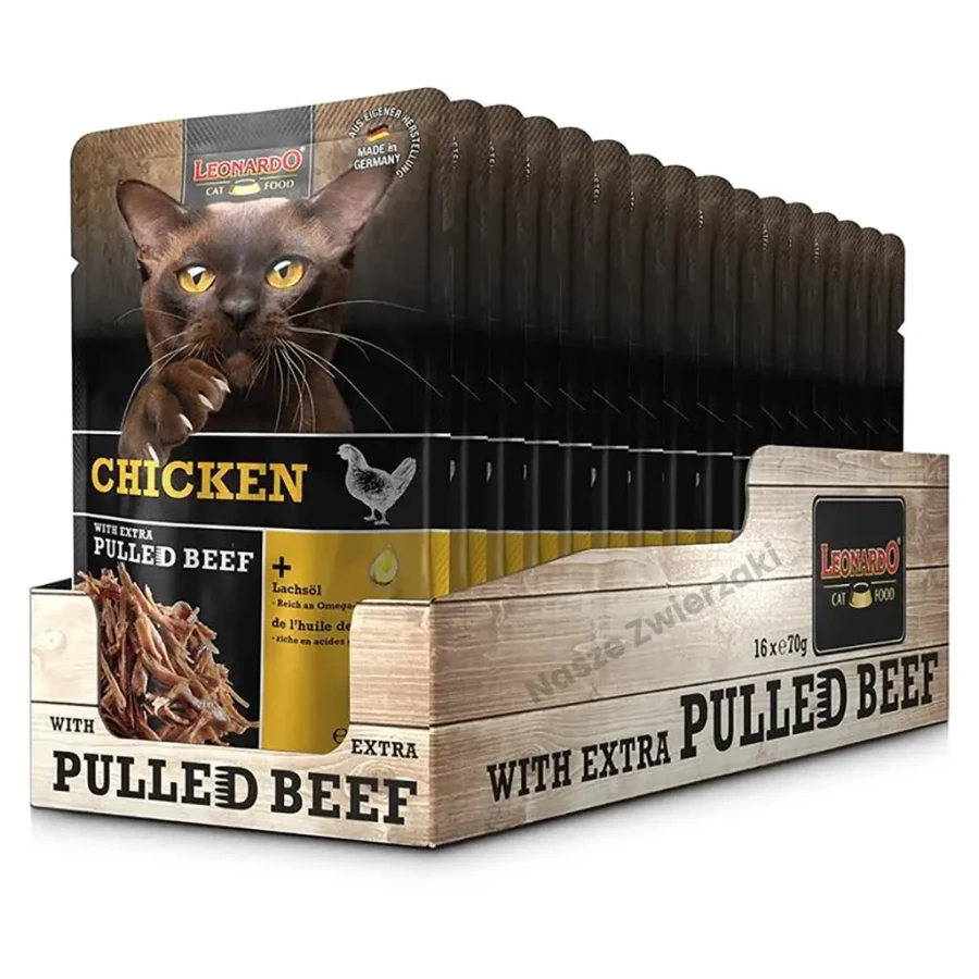 Leonardo Mokra karma dla kotów - kurczak z szarpaną wołowiną 70g to wyjątkowa oferta, która dostarczy Twoim kotom zupełnie nowy smak i niezapomniane doznania podczas posiłków.