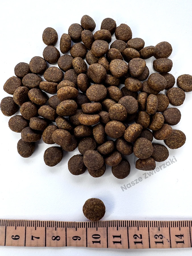 Białko surowe: 32%, Tłuszcz surowy: 11%, Włókno surowe: 3%, Popiół surowy: 8%, Wilgotność: 8%, NFE: 38%, Omega-6: 1,5%, Omega-3: 1,3%, Wapń: 1,2%, Fosfor: 1%