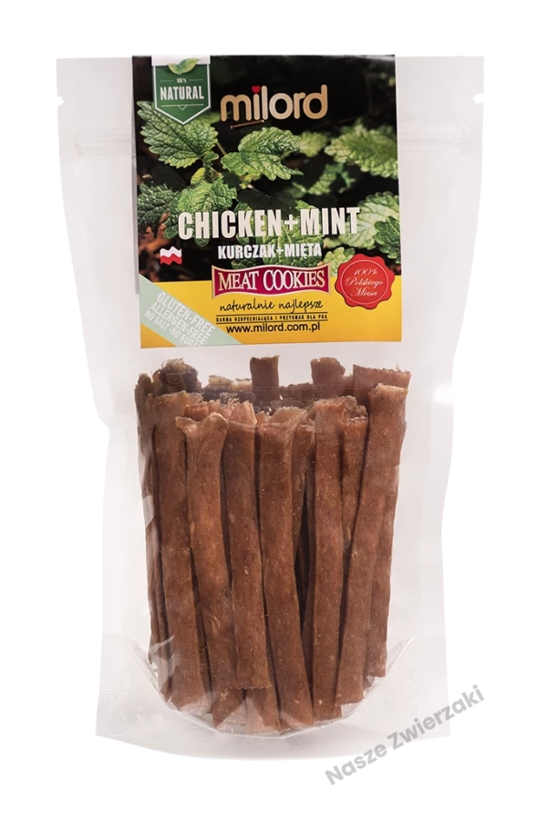 Smaczne i lekkostrawne przysmaki MILORD z kurczakiem i miętą pieprzową to doskonały wybór dla psów w każdym wieku. Zawierają aż 99% mięsa mięśniowego z kurczaka i 1% mięty pieprzowej, znanej ze swoich właściwości wspomagających trawienie oraz łagodzących dolegliwości żołądkowe. Mięta pomaga też odświeżyć oddech i może wspierać proces odchudzania.