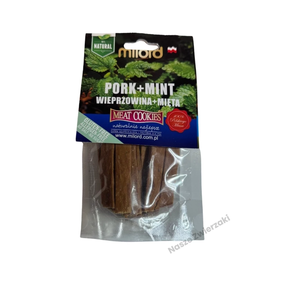Przysmaki MILORD z wieprzowiną i miętą pieprzową to zdrowa i smakowita przekąska dla psów wszystkich ras, także tych z wrażliwym układem pokarmowym.