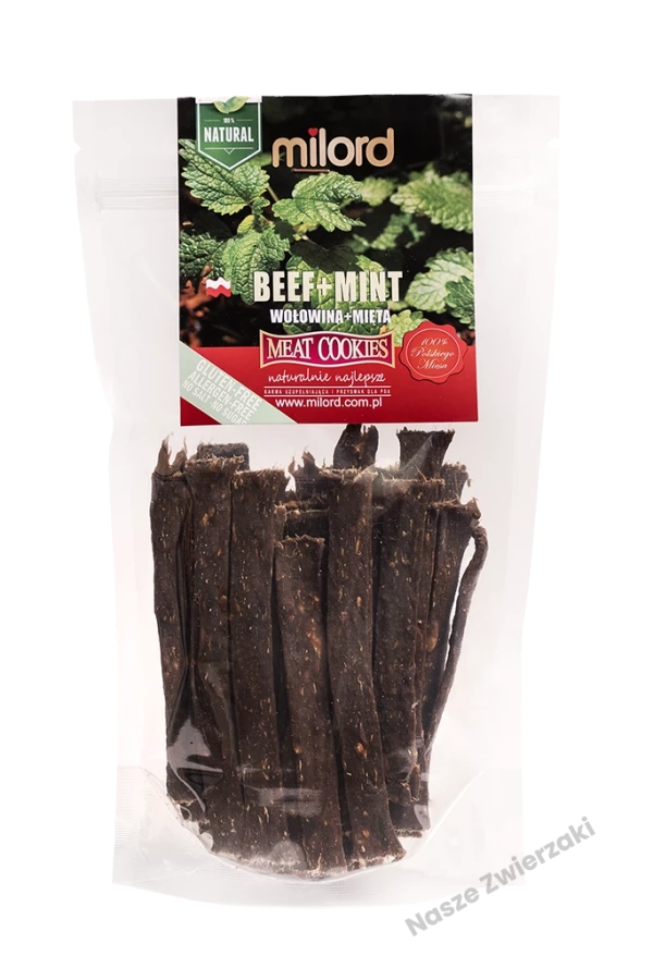 Wyjątkowo aromatyczne przysmaki MILORD z wołowiną i miętą pieprzową to połączenie intensywnego smaku mięsa z delikatnym, odświeżającym dodatkiem ziołowym. Zawierają aż 99% mięsa mięśniowego z wołowiny oraz 1% mięty pieprzowej, która wspiera układ trawienny psa, łagodzi dolegliwości żołądkowe i działa rozkurczowo. Dodatkowo dostarcza cennych witamin (A, C, B1, B9) i minerałów (żelazo, potas, cynk, magnez).